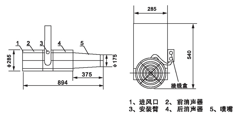 無箱軸流誘導風機由軸流風機、消聲器、噴嘴、固定架組成,回轉角度<60”,噴口φ175。